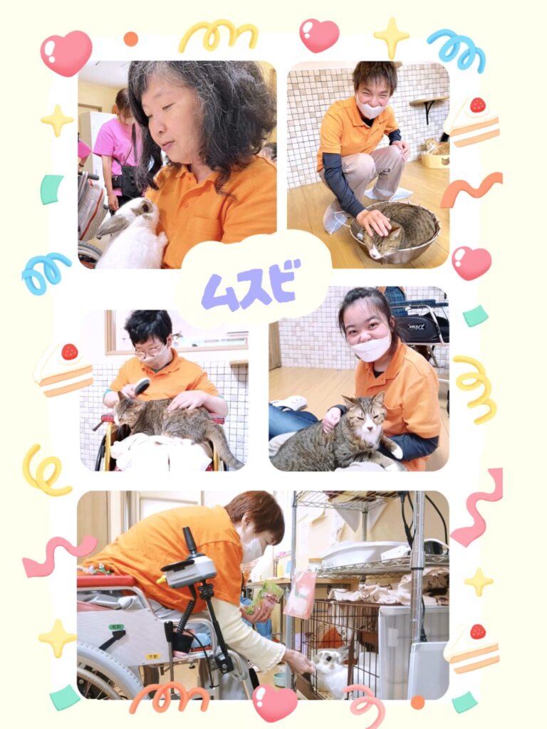 ムスビは、保護ネコカフェを併設した障がい者通所施設です🏡🐾日中活動や生活のサポートはもちろん、利用者様が安心して動物たちと触れ合えることも大切にしています✨動物たちとの触れ合いは自然と笑顔があふれる特別な時間ですね👏🏻🎶